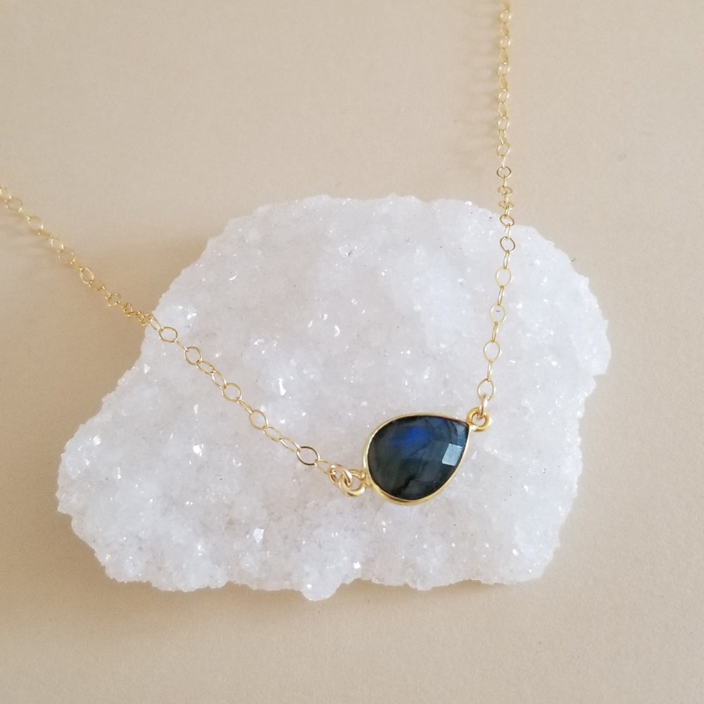 This beautiful necklace features a natural faceted Labradorite pear shaped stone joined to shimmering Gold Filled chain in your choice of length.