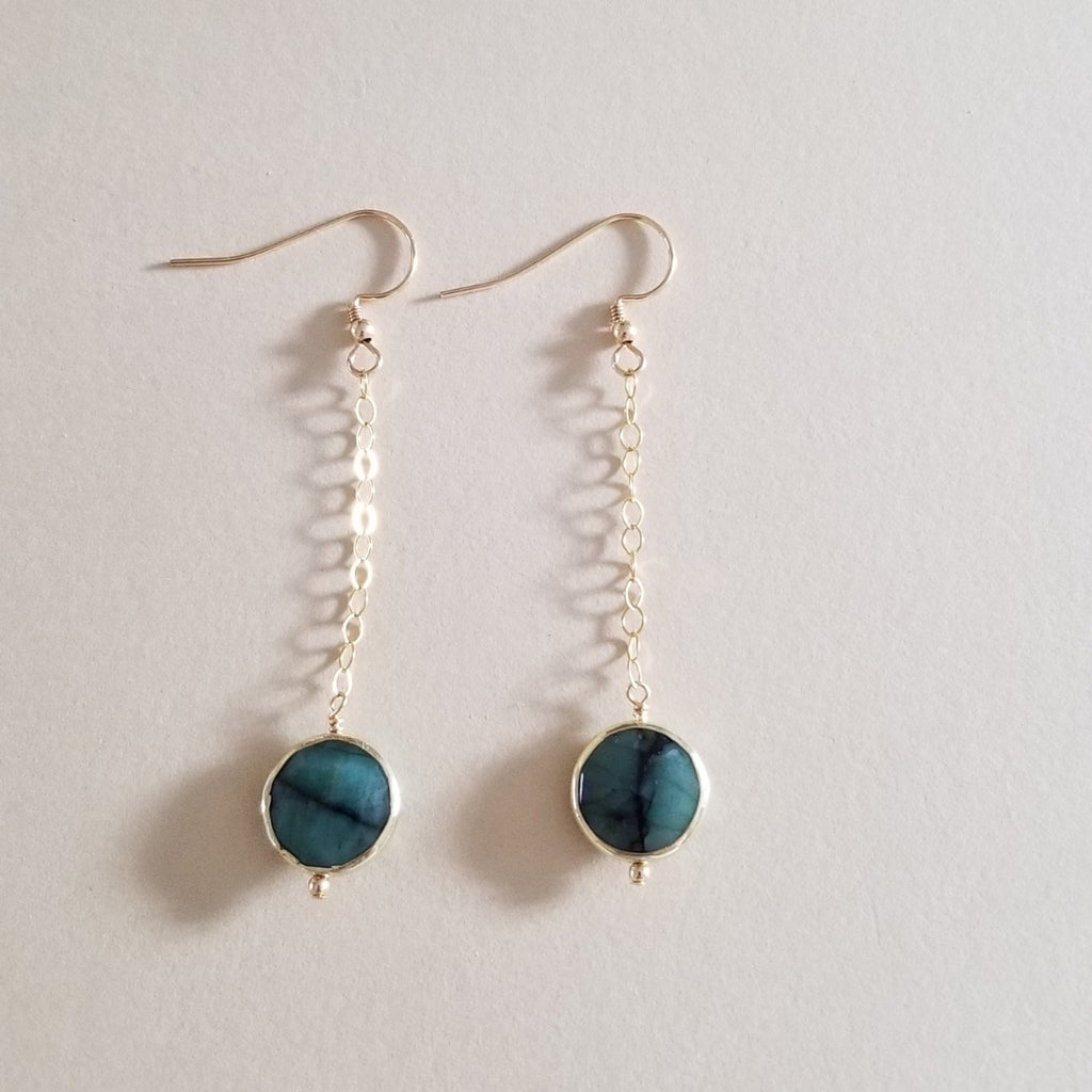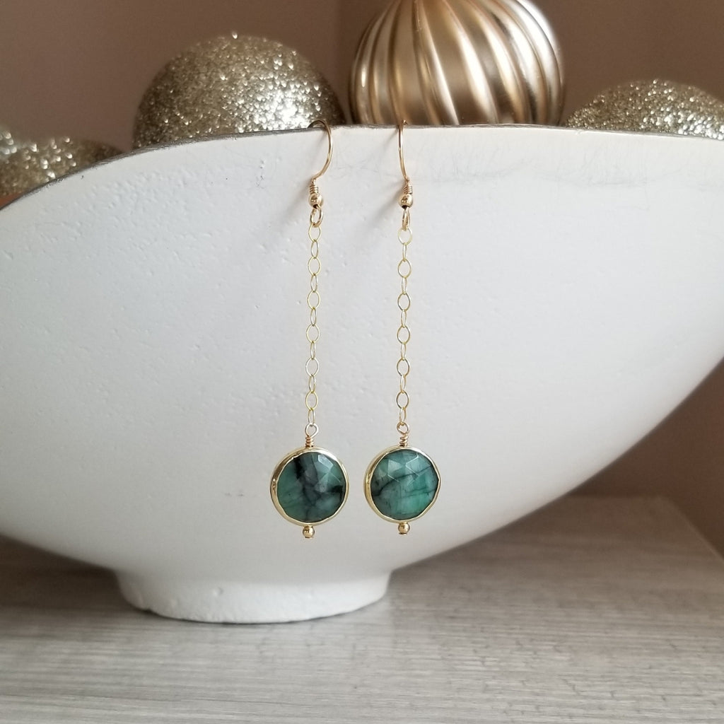 A natural raw Emerald hangs from the tip of shimmering gold filled chain. Your choice of 2 inch or 3 inch length earrings. (3 inch earrings are shown on model)