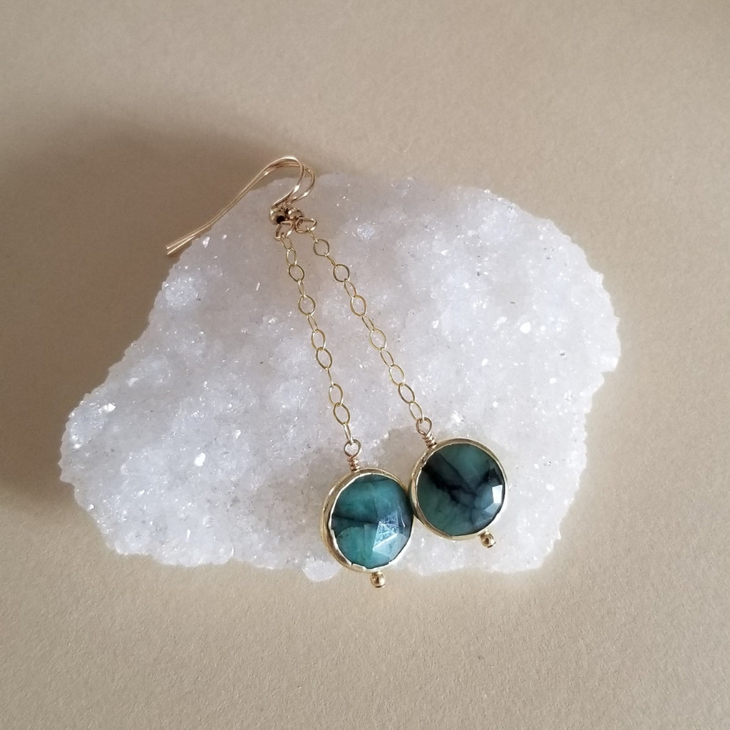 Make a dainty yet dramatic statement in our long gold drop raw Emerald earrings.