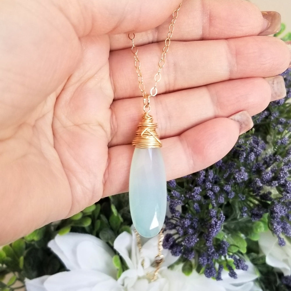 Long Aqua Chalcedony Pendant Necklace, Sterling Silver or 14K Gold Filled